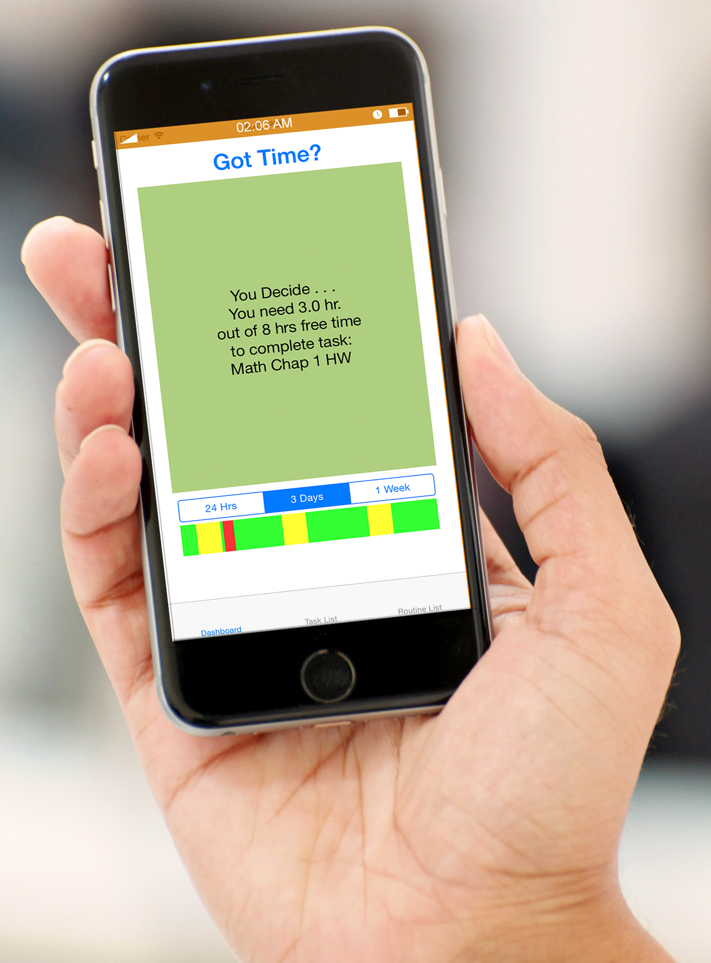 Tasks are automatically color coded. As you begin to run out of free time, the task colors more red and less green. We use an algorithm that relates the time needed to finish a task with your remaining free time from now until the task’s deadline.